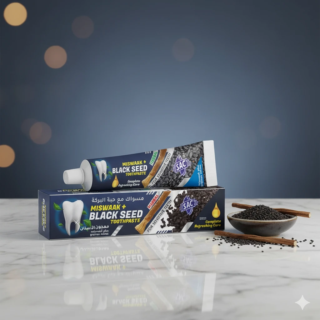 The natural way to protect your smile with our Herbal Miswaak & Black Seed Toothpaste for Sensitive Teeth. Formulated with the timeless power of miswaak extract and the healing properties of black seed (Kalonji), this toothpaste is specially crafted for people with sensitive gums and teeth. It gently cleanses, strengthens enamel, reduces plaque, and provides long-lasting freshness without the use of harsh chemicals. The herbal blend not only soothes sensitivity but also prevents cavities, bad breath, and gum issues, making it an ideal choice for natural oral care.