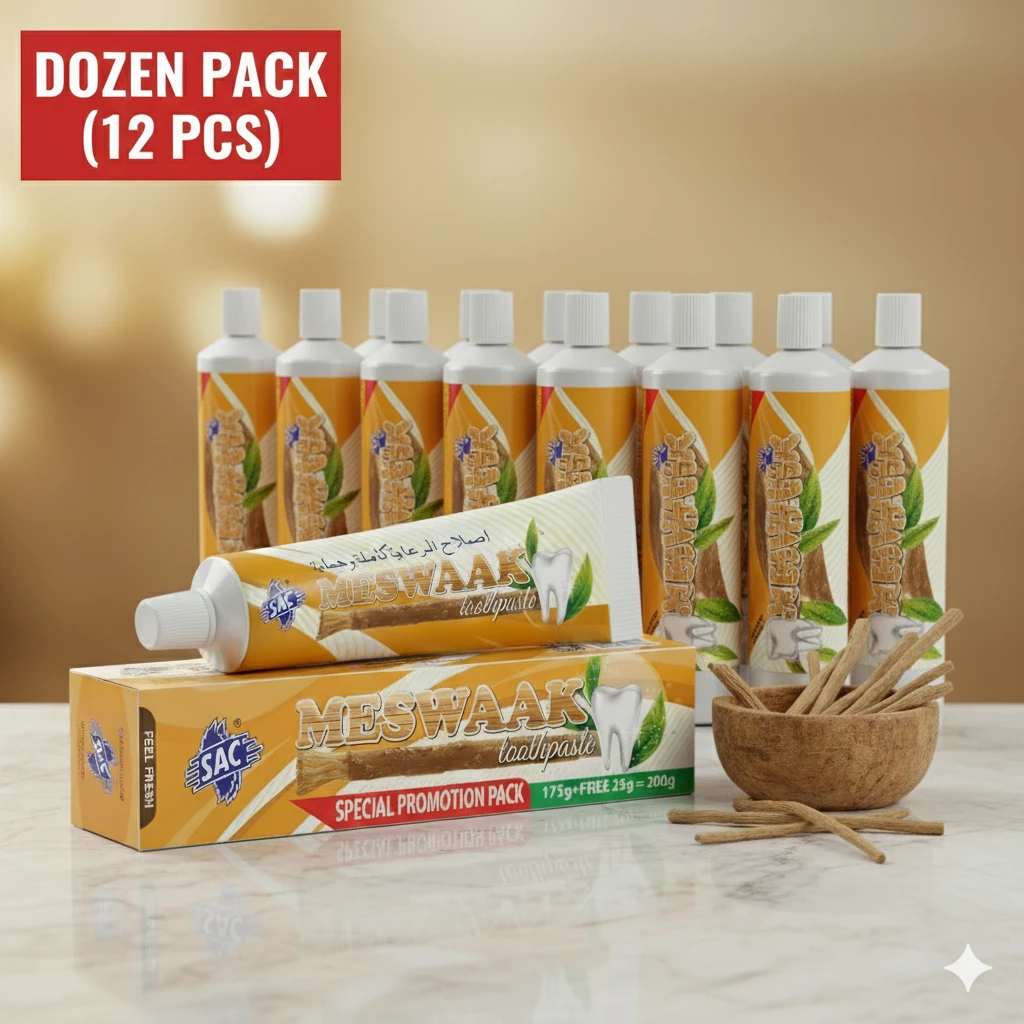 The power of nature with our Herbal Miswaak Toothpaste, now available in a Dozen Pack (12pcs) for long-lasting freshness and care. Inspired by the natural cleansing properties of the miswaak (Salvadora Persica), this toothpaste is crafted to give you a refreshing and effective oral care solution without harmful chemicals.